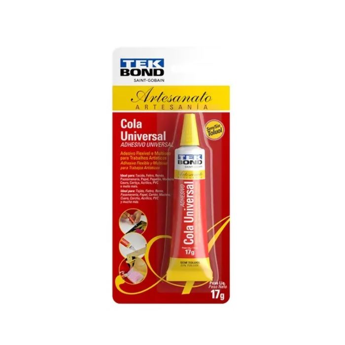 A Cola Universal Artesanato da Tekbond é transparente e viscosa, e sua fórmula foi cuidadosamente elaborada a partir de uma borracha especial. Quando seca ela adquire duas das melhores qualidades que uma cola pode ter: fica superforte e flexível. É fácil de usar e fixa tudo rapidamente.