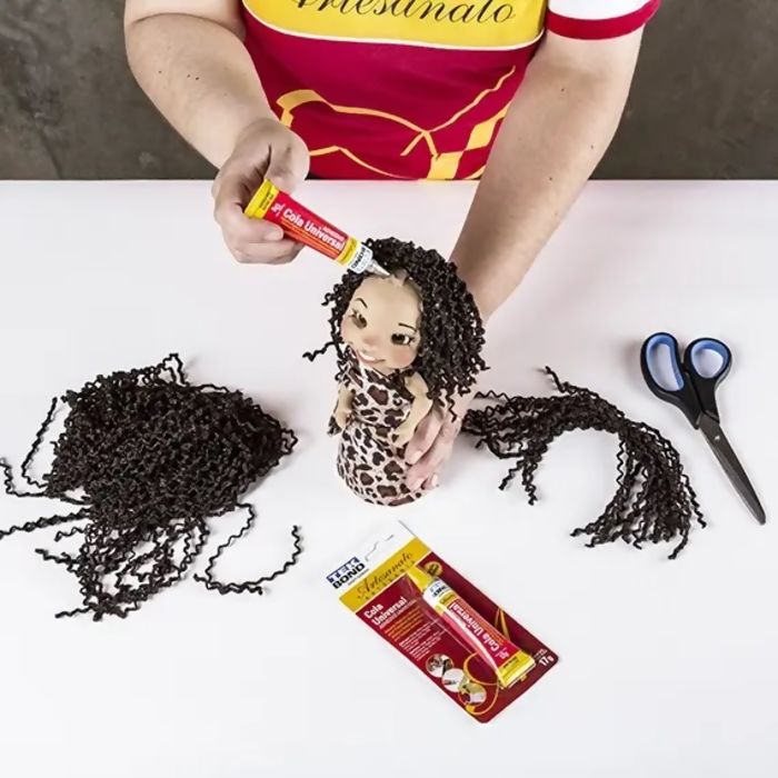 Nos artesanatos, é bastante utilizada para a colagem de tecidos em bonecos de pano e na fixação de cabelos sintéticos em bonecos de biscuit. E olha só, é resistente à água e óleo, então serve pra várias situações.