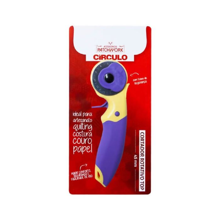 O cortador Rotativo Circulo possui trava de segurança e encaixa perfeitamente na mão, proporcionando maior conforto e facilidade de uso.  Ideal para cortes retos e com precisão em trabalhos de costura, quilt, papel e artesanato em geral.