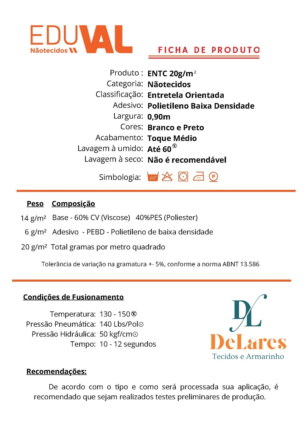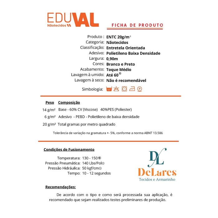 Dados Técnicos Entretela de Papel Com Cola - ENTC - 20Gr - 1,00m X 0,90m