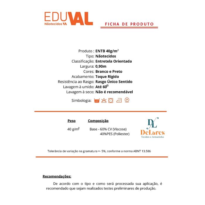 Dados Técnicos Entretela de Papel SEM Cola - ENTB - 40Gr - 1,00m X 0,90m