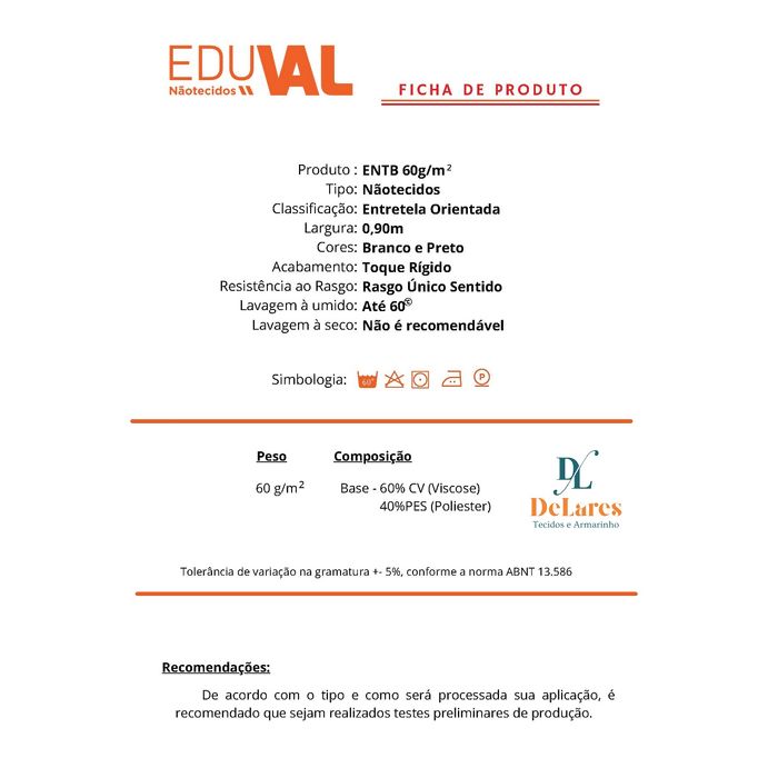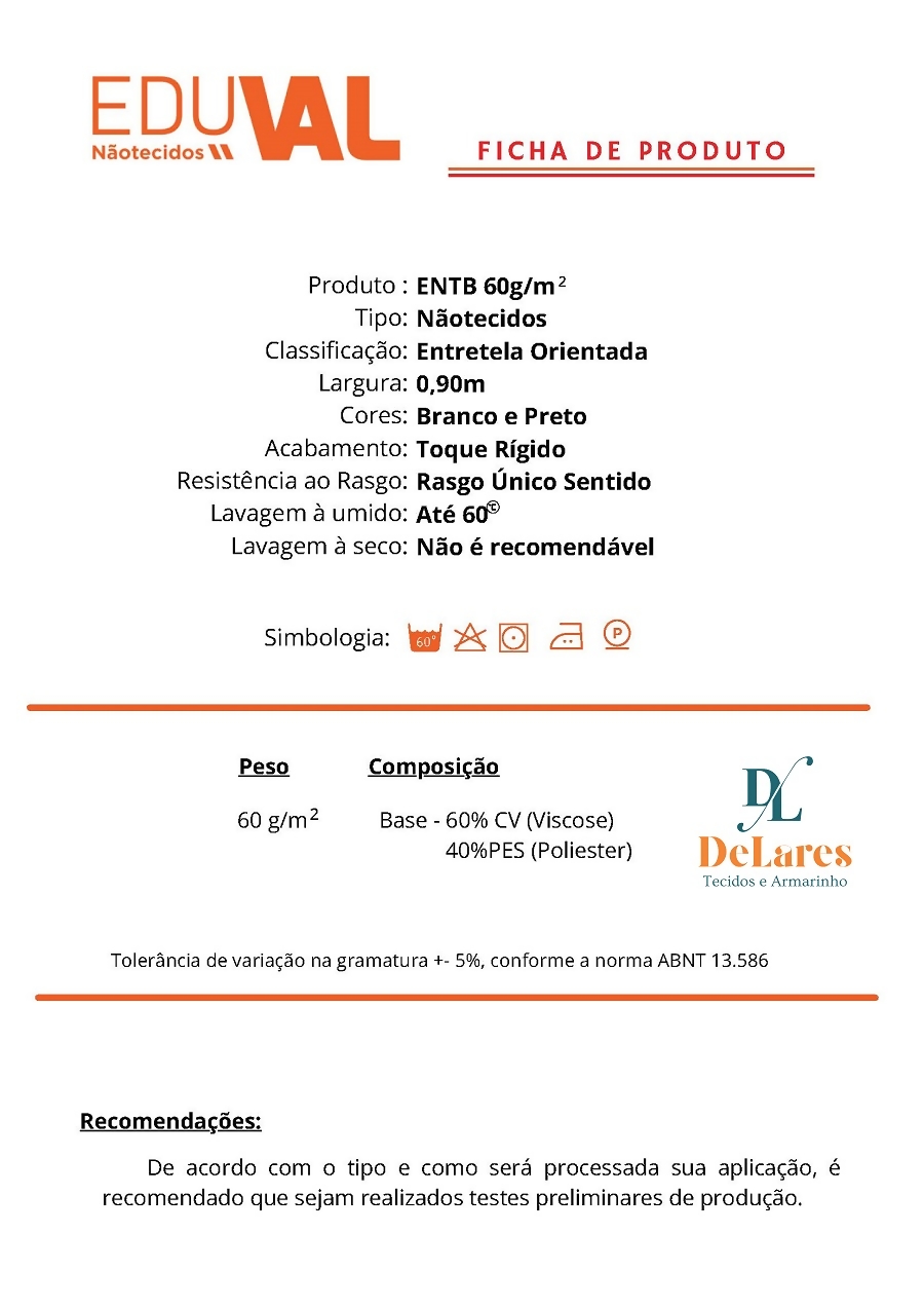 Dados Técnicos Entretela de Papel SEM Cola - ENTB - 60Gr - 1,00m X 0,90m
