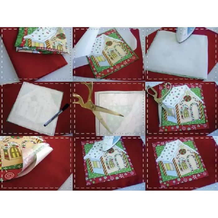 1) Unir o avesso do tecido ao termocolante (parte transparente) passando o ferro sobre o papel siliconado que protege o termocolante (parte branca) em temperatura média (150ºC), sem vapor, por aproximadamente 30 segundos. Repetir a operação, se necessário, até que as superfícies fiquem unidas.