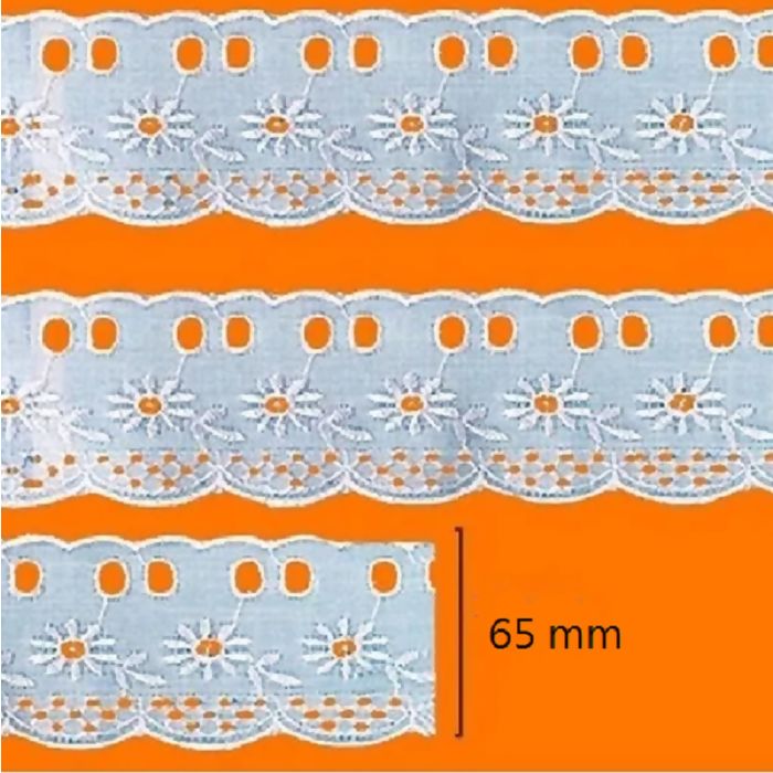 Bordado Inglês CTL 72 Cor 101 Branco Peça com 13,7m de comprimento e 6,5cm de largura Composição: 90% Poliéster 10% Algodão