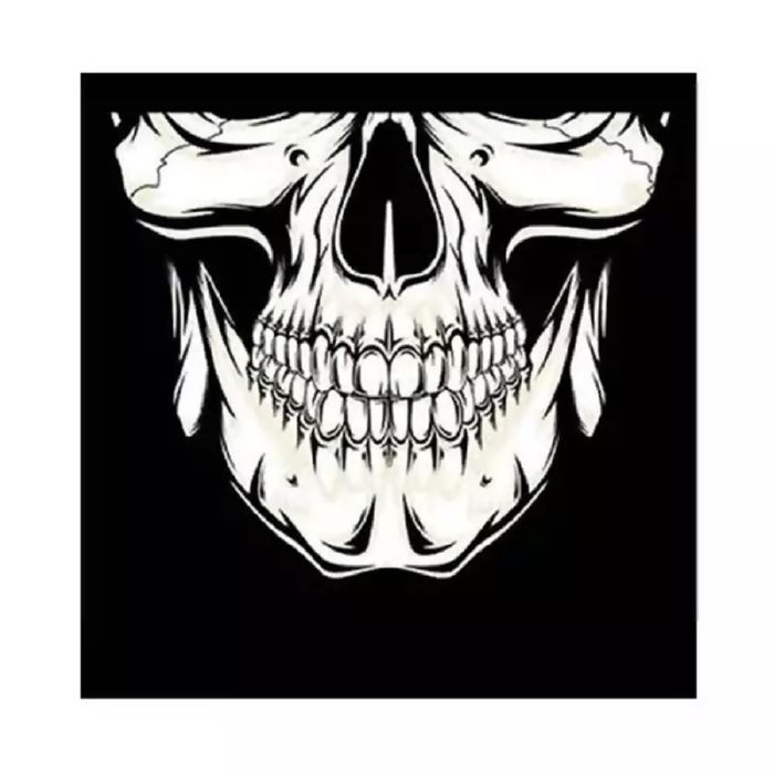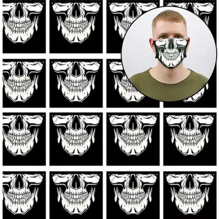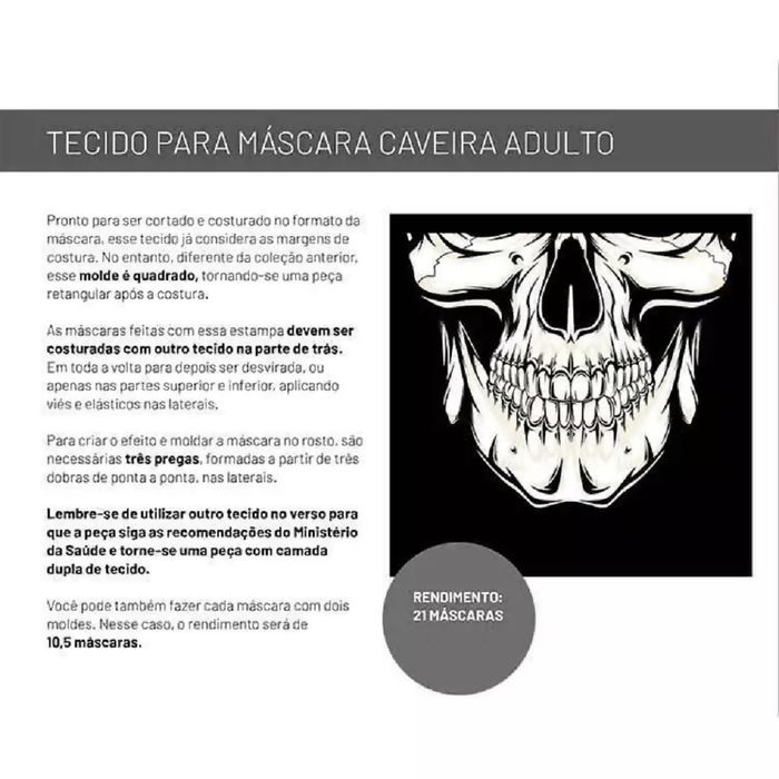 Tecido para Máscara com Molde Quadrado Circulo 2346 - Caveira Largura: 1,44 metros Comprimento: 0,58cm Composição: 100% Algodão Rendimento: 21 Máscaras Simples e 10,5 Máscaras Duplas.