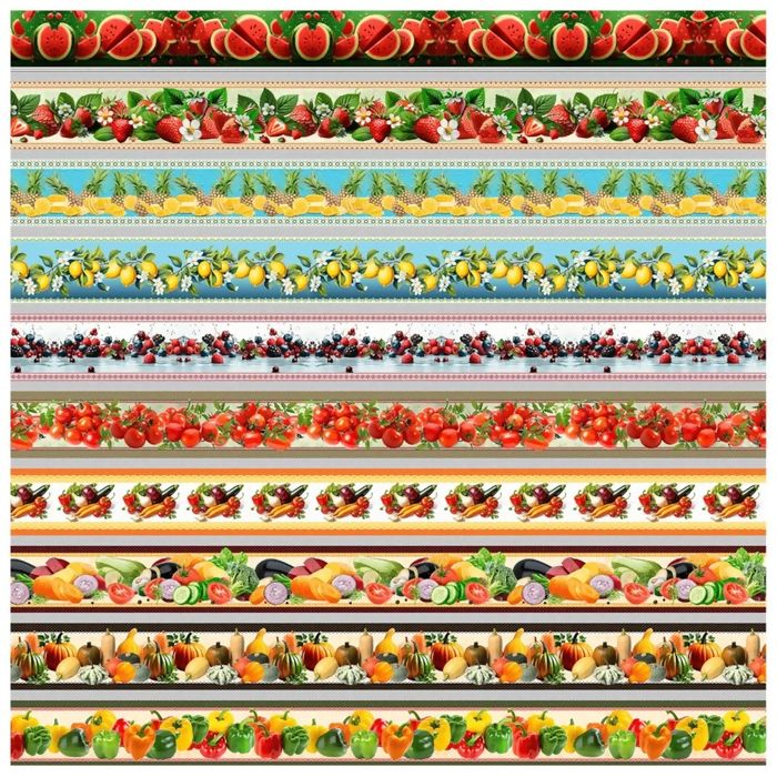Descrição Tecido Tricoline 100% Algodão - Barrado Digital - 250127 - Frutas e Vegetais - 0,50m x 1,50m