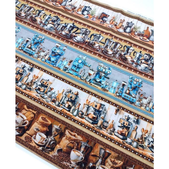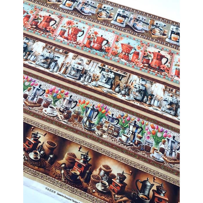 Descrição Tecido Tricoline 100% Algodão - Barrado Digital - 250160 - Cafeteria - 0,50mt x 1,50mts