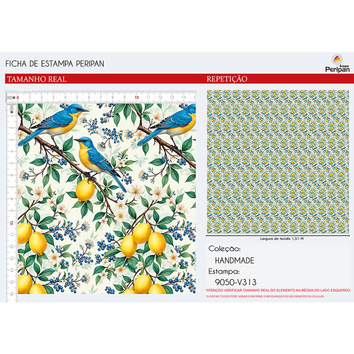 Quanto mede cada Unidade? Tecido Tricoline 100% Algodão - Pássaros e Limões - D9050 - V313 - 0,50m x 1,50m