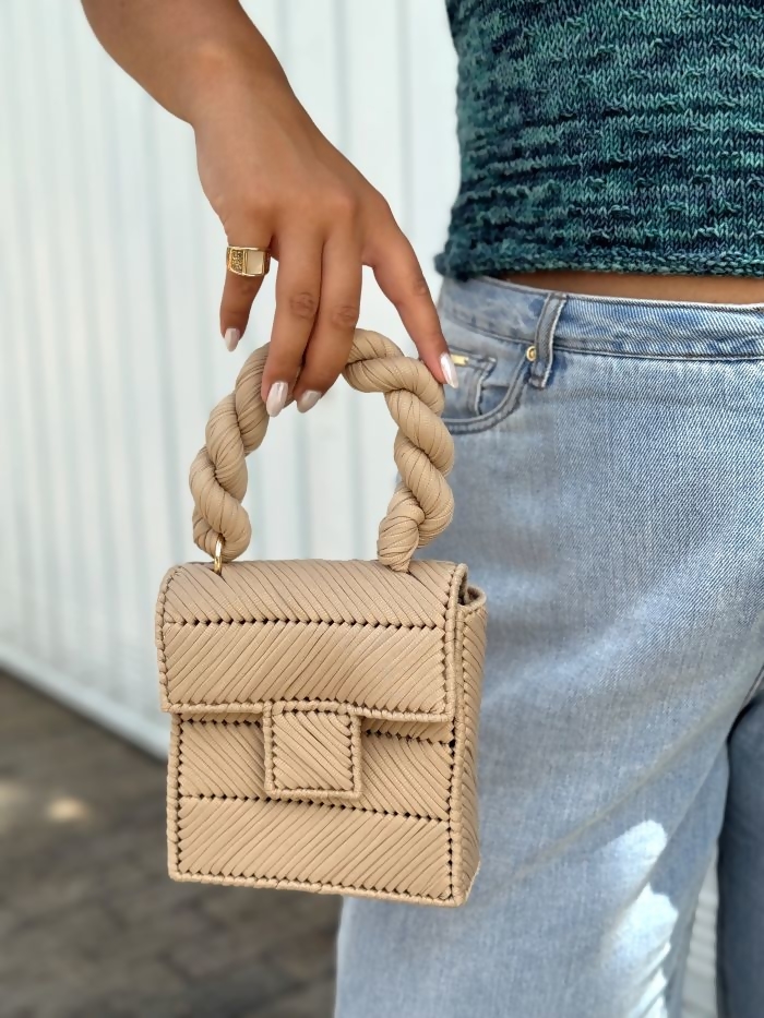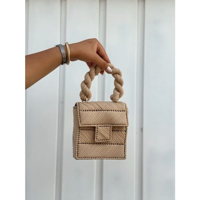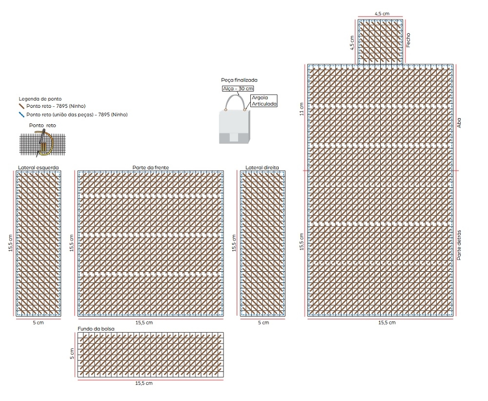 Bolsa: Use a ag. de tapeçaria e o fio de Malha Premium na cor Ninho. Borde as telas plásticas (lateral esq., parte da frente, lateral dir., fundo da bolsa, fecho, aba e parte detrás) como se apresentam nos diag. em ponto reto. Montagem: Faça a montagem das telas em ponto reto unindo as laterais dir. e esq. na parte detrás e na parte da frente. Prenda o fundo da bolsa. Na borda superior da bolsa trab. também uma carr. de ponto reto como acabamento. OBS.: O acabamento está representado no diag. com a linha em azul pontilhada. Alça torcida: Envolva o papelão com 20 voltas (80 cm de comp.) do fio de Malha Premium na cor Ninho. Dê um nó unindo o início e fim do fio de malha. Retire o fio do papelão e faça a torção dos fios. Transpasse a argola articulada do centro do cordão torcido. Dobre-o ao meio e prenda a outra argola articulada. Transpasse as argolas articuladas na bolsa. Finalização: Mude para a ag. de costura e com o fio de naylon prenda o botão magnético na parte interna da aba e sobre a parte externa da frente.